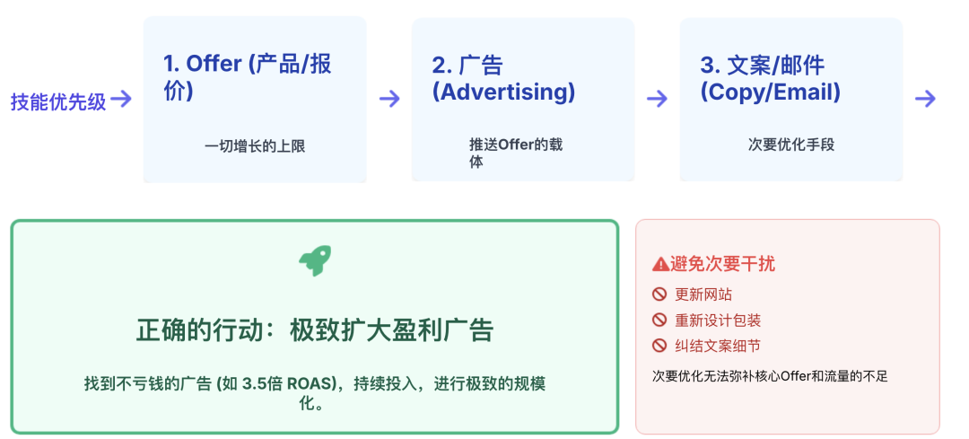 作者他将营销技能的重要性做了一个排序:Offer > 广告 > 文案/邮件。